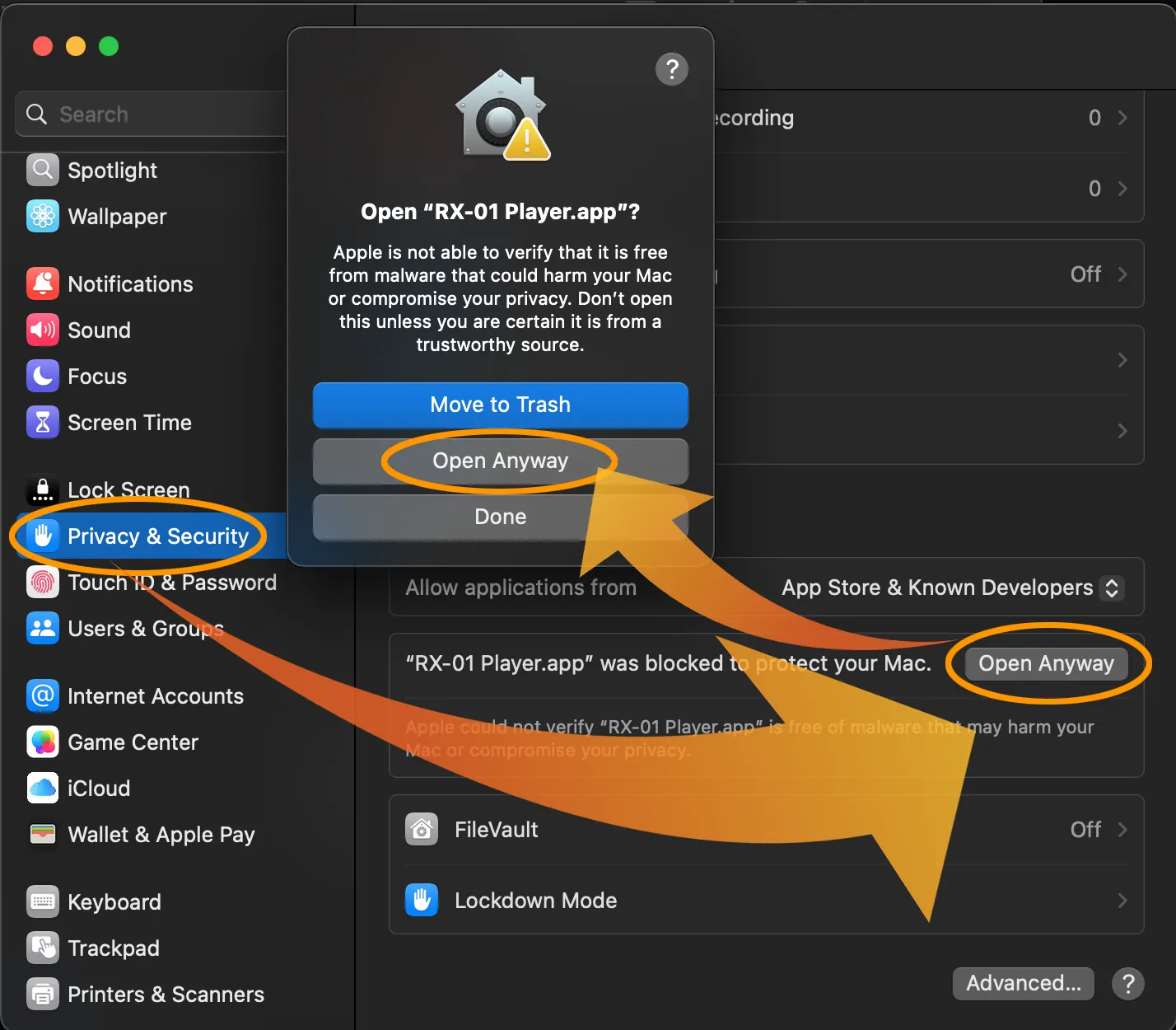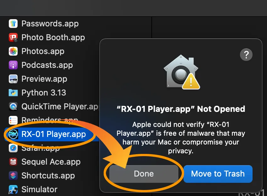 MacOSのGatekeeper機能により、App Storeや認証された開発元以外のアプリを初めて開く際に警告が表示されます。以下の方法でRX-01 Playerを起動できます。