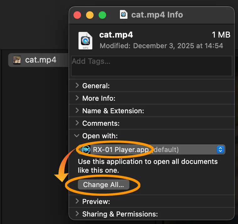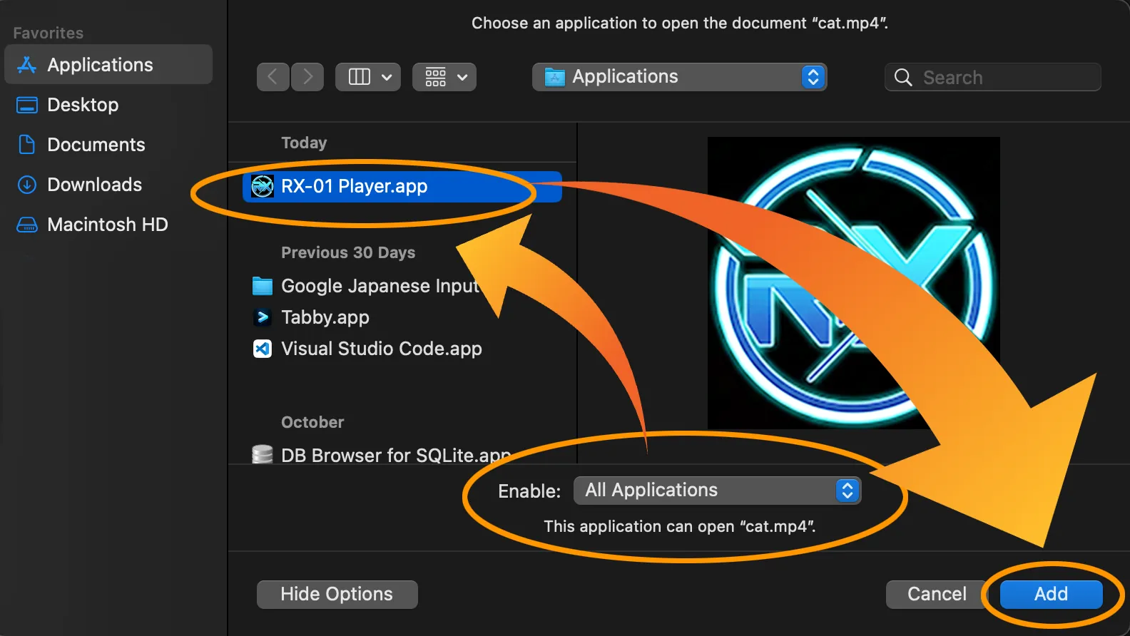 動画ファイルをダブルクリックした時に自動的にRX-01 Playerで開くように設定できます。この設定は任意ですが、設定しておくと毎回アプリを起動する手間が省けて便利です。