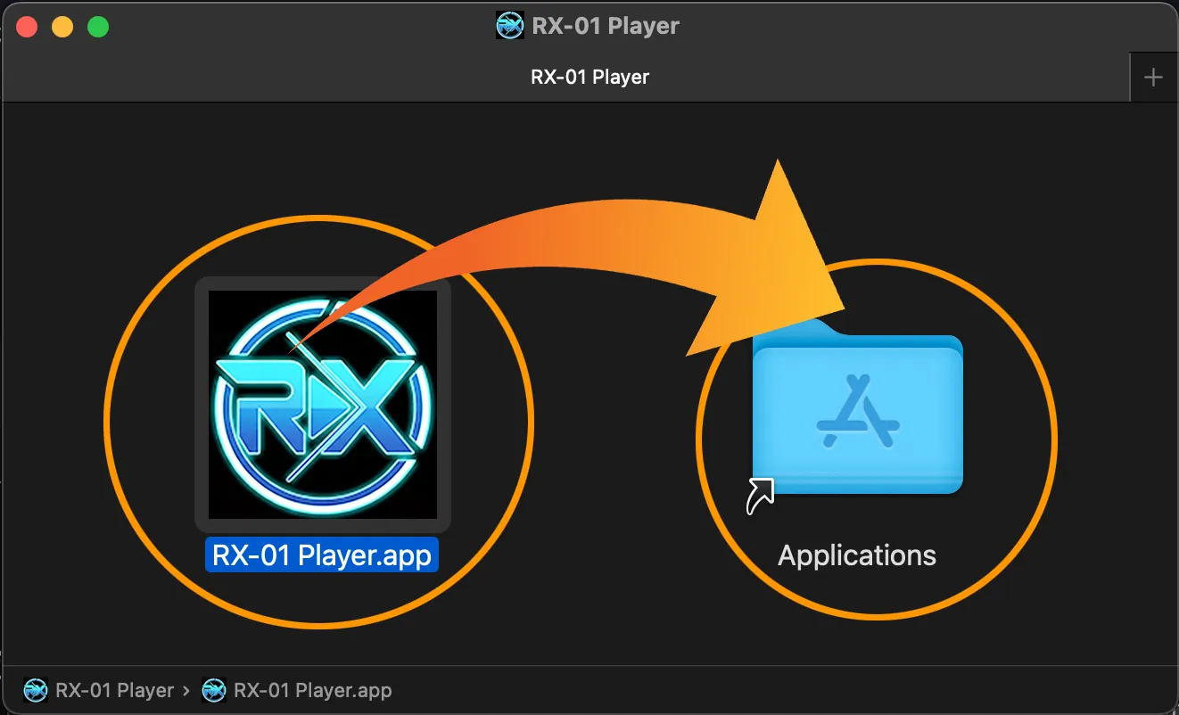 表示されたウィンドウで、RX-01 Playerのアイコンをアプリケーションフォルダにドラッグ&ドロップします。
