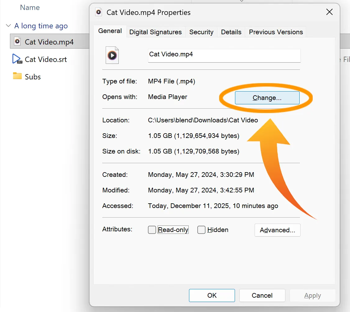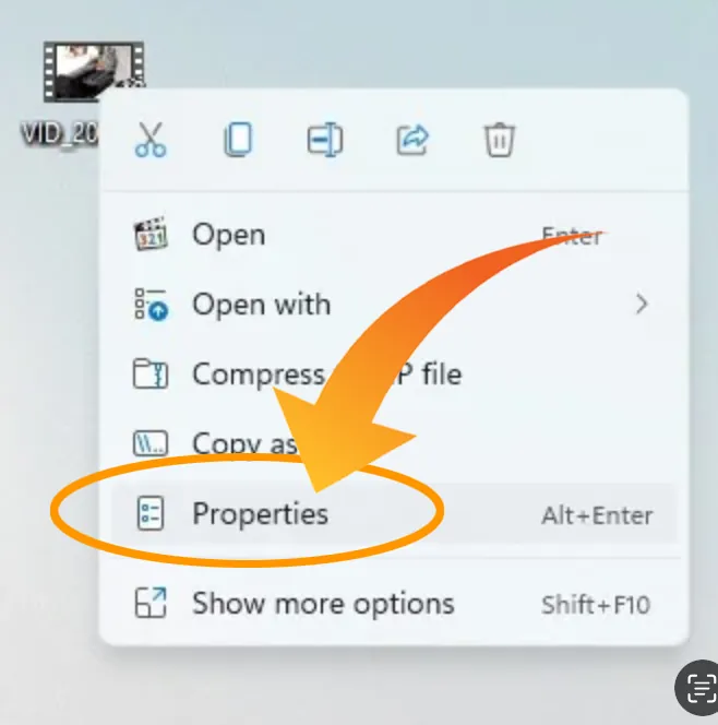 関連付けたい動画ファイル(例:movie.mp4やvideo.mkvなど)を右クリックして、「プロパティ」をクリックします